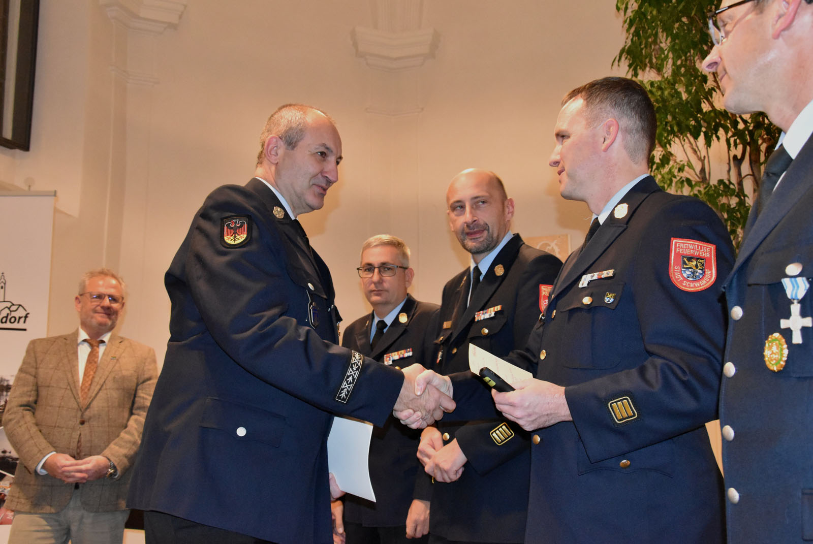 Außerdem wurden zwei Aktive (Josef Schmid – FF Gögglbach und Markus Jäger – FF Ettmannsdorf) für besondere Verdienste geehrt. SBI Klaus Brunner konnte hierzu Ehrengäste aus Politik und der Feuerwehr-Landkreisführung begrüßen. In den Grußworten würdigten die stellv. Landrätin Birgit Höcherl, Oberbürgermeister Andreas Feller und Kreisbrandrat Christian Demleitner die geleisteten Verdienste.