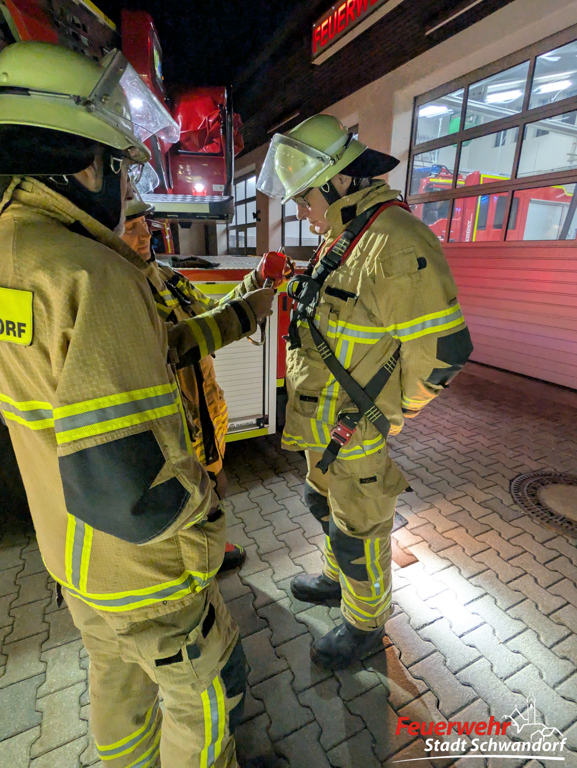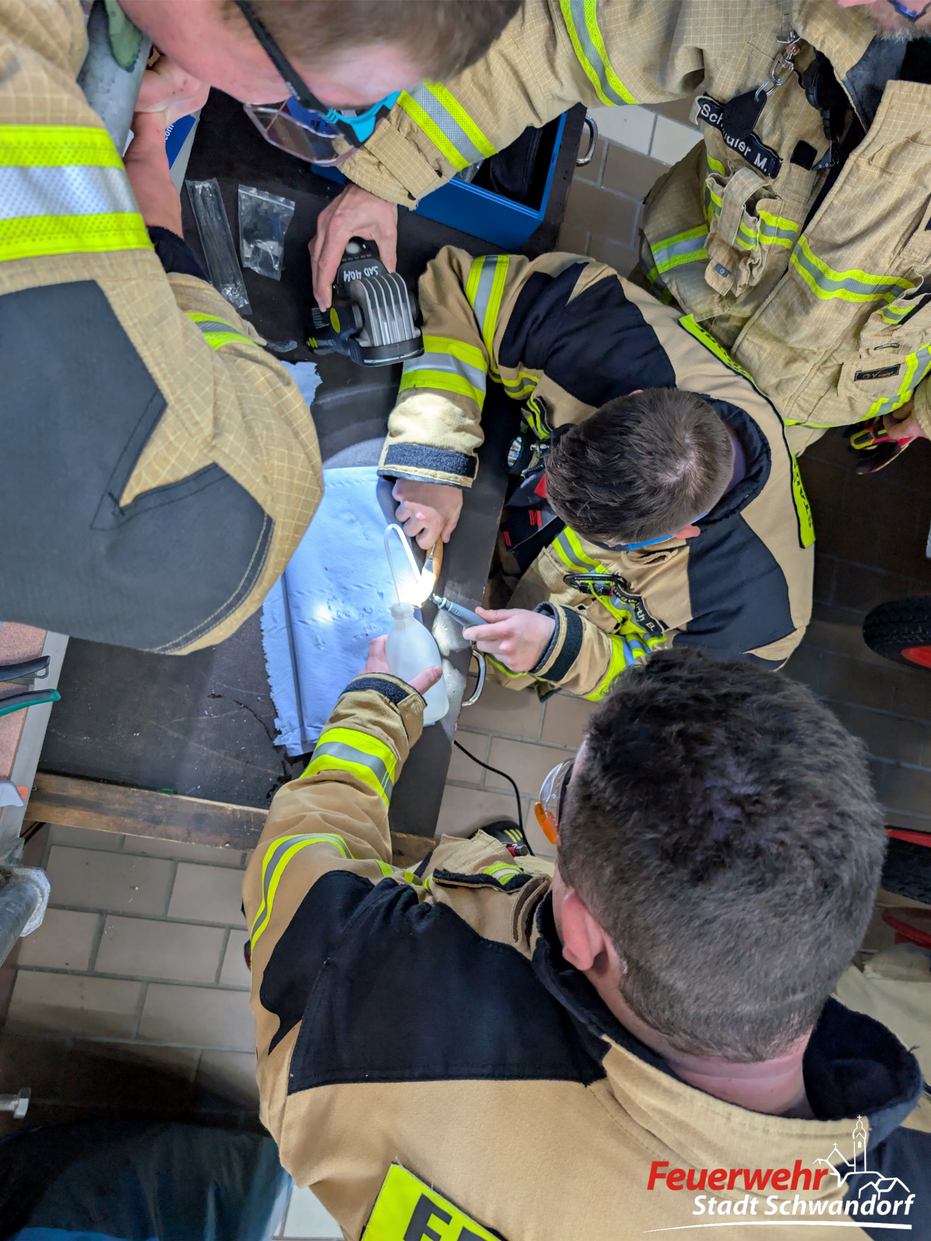 An insgesamt vier Stationen wurden am letzten Übungsmontag unsere Aktiven in Kleingruppen beschult. An der Drehleiter wurde der Aufbau der Trage samt Gestell geübt. Ebenso das richtige Anlegen des dazugehörigen Gurtes zur Sicherung. Außerdem wurden die verschiedenen Drucklüfter angesprochen und deren Einsatz- und Verwendungsmöglichkeiten besprochen. An einer weiteren Station wurde das Entfernen von Gegenständen (z. B. eines Ringes am Finger) geübt. An der vierten Station wurde die Handhabung der Tauchpumpe und des Wassersaugers geschult.