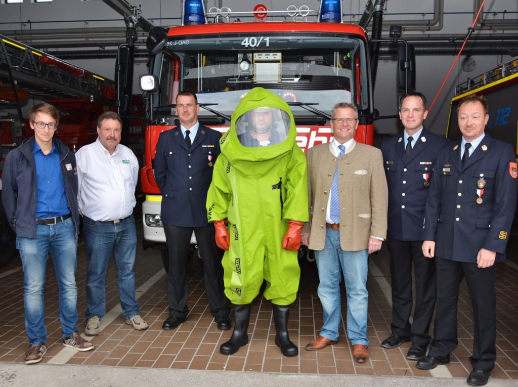 Am Dienstag, den 15.09.2015 wurde durch die Fa. MSA Auer insgesamt 6 neue Chemiekalienschutzanzüge übergeben. Diese Neubeschaffung war notwendig geworden, da die bisherigen aufgrund ihres Alters von 10 Jahren ausgesondert werden mussten. Die erhaltene, neue, Generation von Anzügen hat aufgrund der technischen Weiterentwicklung nun eine Haltbarkeit von 15 Jahren. Die erhaltenen CSA sind ab sofort im entsprechenden Fahrzeug verlastet und stehen bei möglichen Einsätzen zur Verfügung. Foto: Dietmar Zwick v.l.n.r.: Dominik Fischer, Gebietsleiter MSA Alfred Schindler, Thomas, Rimgaila, Andreas Feller, Klaus Brunner, Helmut Mösbauer