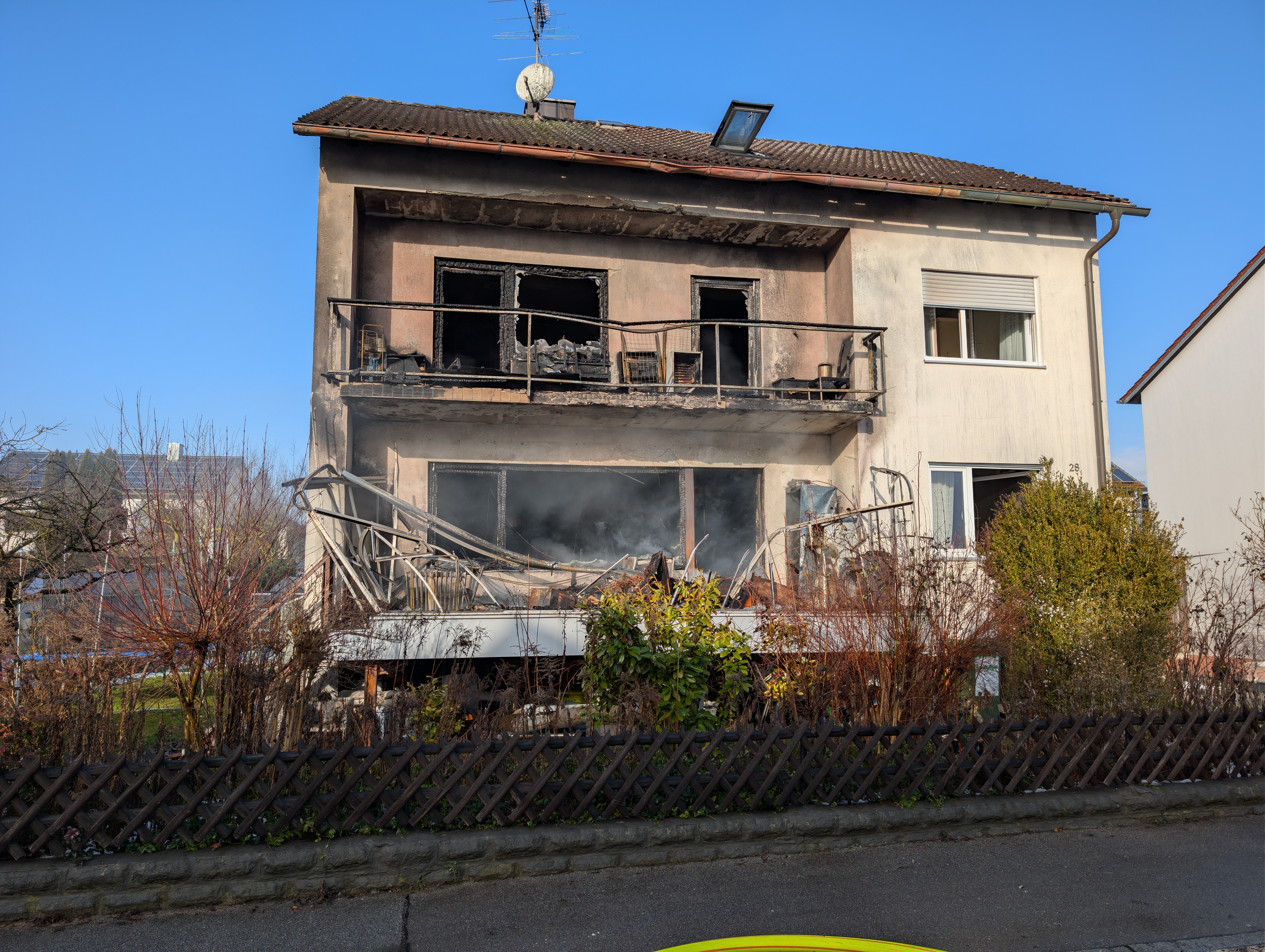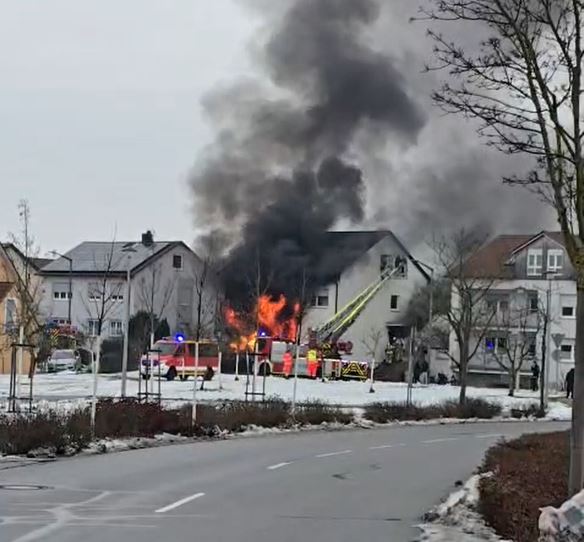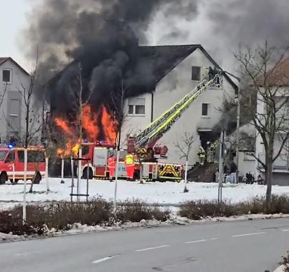 | Einsatzbericht | Bei der Alarmierung über die ILS hieß es “ Wohnhausbrand / Personen in Gefahr „. Beim Eintreffen an der Einsatzstelle war die Frontseite eines Mehrfamilienhauses in Vollbrand, zudem war der Fluchtweg für drei Bewohner aus dem Dachgeschoss abgeschnitten. Diese wurden mit Hilfe der Drehleiter gerettet, während von außen her ein massiver Löschangriff mit Wasser gestartet wurde. Zudem wurden mehrere Trupps unter schwerem Atemschutz in den Innenangriff geschickt um ebenfalls mit Wasser von dort den Brand zu bekämpfen. Dies führte dazu, das das Feuer selbst zügig bekämpft wurde und nach kurzer Zeit der Brand selbst gelöscht war. Mit Hilfe einer Wärmebildkamera wurde anschließend noch nach Glutnestern gesucht und diese abgelöscht. Nachdem keine Gefahr mehr davon ausging, konnten wir die Einsatzstelle an die Polizei übergeben und diese verlassen. Polizei, Notarzt, Rettungsdienst, Energieversorger, THW und das Landratsamt waren ebenfalls vor Ort.