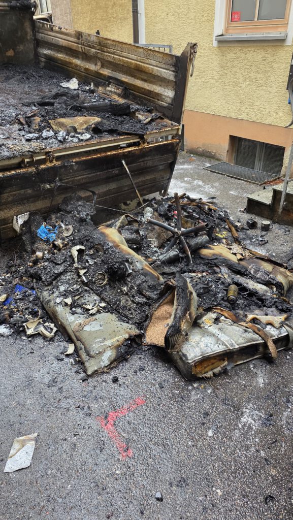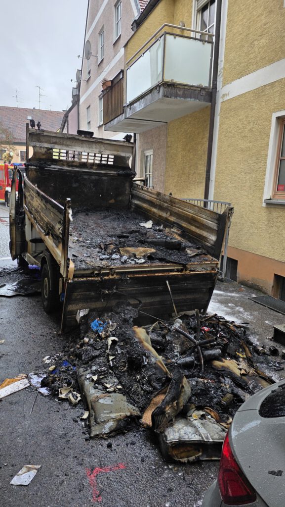 | Einsatzbericht | Bei der Alarmierung über die ILS hieß es “ Brand LKW – Ladung „. Beim Eintreffen an der Einsatzstelle brannte in einer Sackgasse ein kleiner Pritschenwagen samt Ladung. Unsere Aufgabe bestand darin zum einen den Brand unter schwerem Atemschutz mit Hilfe von Wasser zu löschen, zum anderen die angrenzenden Häuser zu kontrollieren, da doch eine starke Rauchentwicklung vorhanden war, nich das diese durch offene Fenster in die Wohnungen gelangte. Nachdem der Brand gelöscht und auch die kontrollierten Wohnungen rauchfrei waren, wurden noch mit Hilfe der Drehleiter und einer Wärmebildkamera die Dachvorsprünge und die Fassaden in direkter Nähe kontrolliert. Nachdem keine Gefahr mehr bestand, konnten wir die Einsatzstelle wieder verlassen. Polizei und Rettungsdienst waren ebenfalls vor Ort.