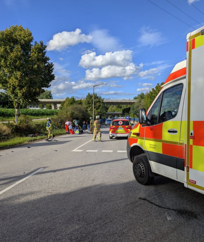 | Einsatzbericht | Bei der Alarmierung über die ILS hieß es “ Verkehrsunfall / Pkw – Motorrad „. Beim Eintreffen an der Einsatzstelle war ein Pkw mit einem Motorrad kollidiert. Unsere Aufgabe war es die Straße für den Verkehr komplett zu sperren, den Verkehr zu regeln mit den zusätzlich alarmierten Feuerwehr und den Rettungsdienst zu unterstützen bei der Versorgung des verletzten Motorradfahrers. Nachdem der Rettungsdienst auf dem Weg ins Krankenhaus, der Unfall aufgenommen und die Straße gesäubert war ( Motorrad abgeschleppt ), konnten wir die Unfallstelle wieder verlassen. Polizei, Notarzt und Rettungsdienst waren ebenfalls vor Ort.