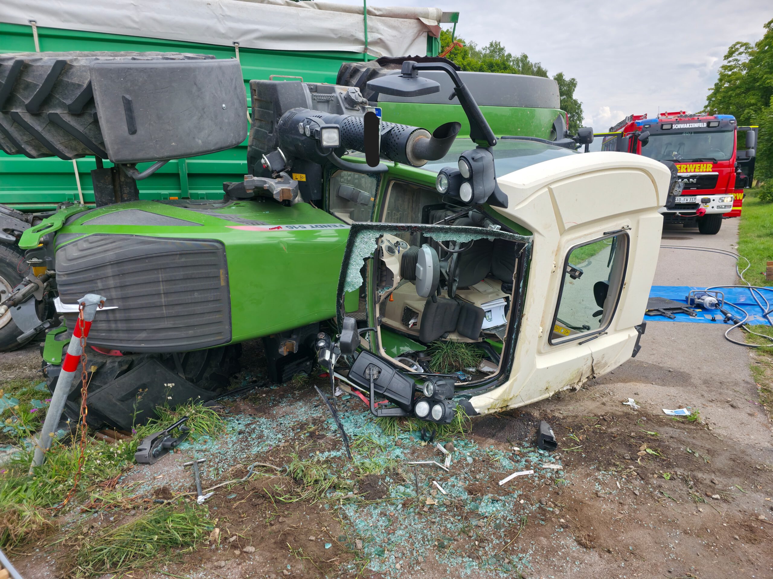 | Einsatzbericht | Bei der Alarmierung über die ILS hieß es “ Verkehrsunfall / Person eingeklemmt „. Beim Eintreffen an der Einsatzstelle war eine Person in seiner Traktorkabine eingeklemmt, diese lag verkeilt auf der Seite unter einem Anhänger. Unsere Aufgabe war es die weiteren anwesenden Einsatzkräfte bei der Rettung des Fahrers mit Unterbaumaterial zu unterstützen. Zudem übernahmen wir die Verkehrsabsicherung / Sperrung der Straße. Nachdem der Fahrer aus seiner misslichen Lage befreit und und mit Hilfe eines Hubschraubers in eine Klinik geflogen worden war, konnten wir die Einsatzstelle wieder verlassen, die Sperrung übernahmen die weiteren Einsatzkräfte. Polizei, Notarzt, Rettungsdienst und ein Rettungshubschrauber waren ebenfalls vor Ort.